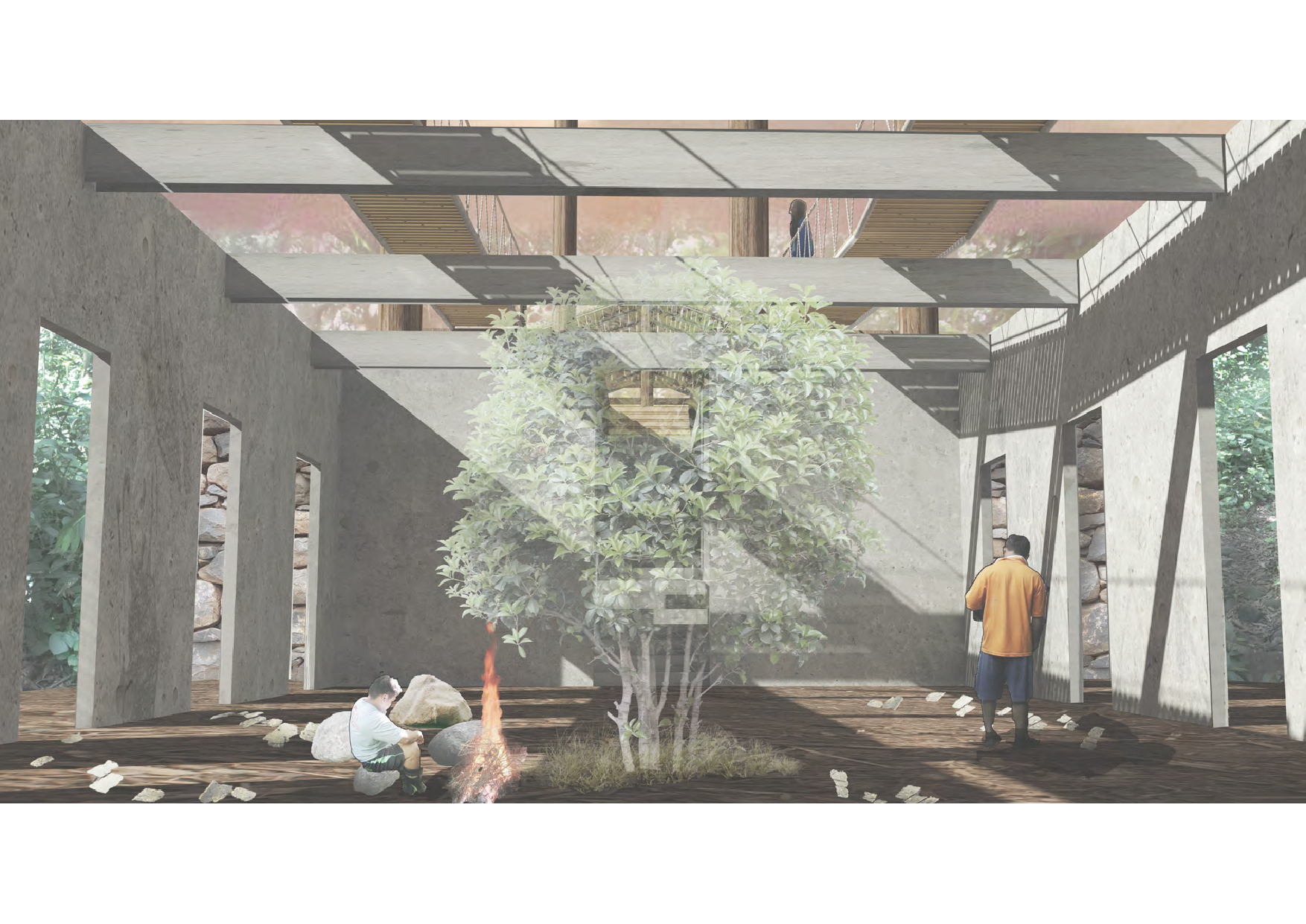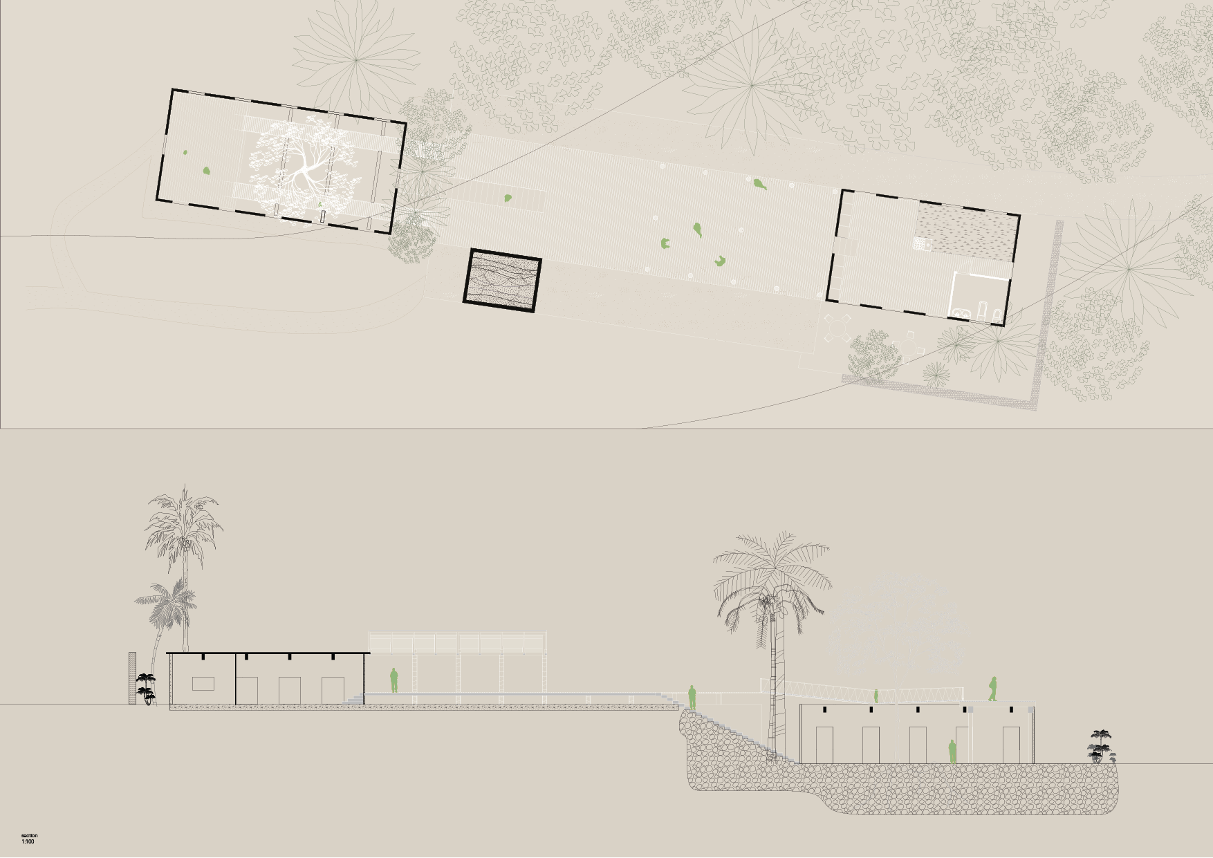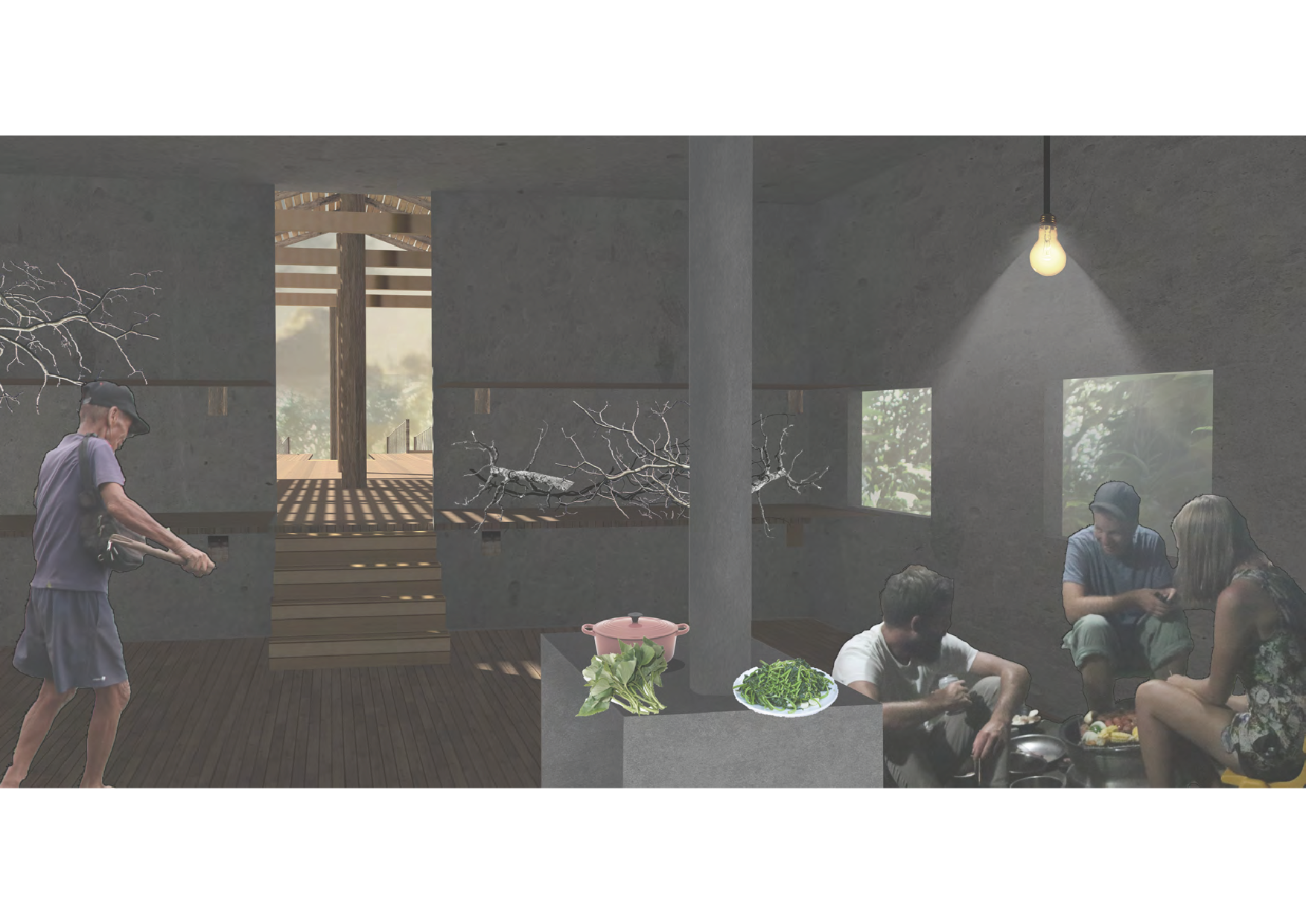 Struktuur oli ette nähtud ühendama kahte hoonet omavahel, mida hetkel omavahel ühendab ning ka eraldab nende vahela suv betoonväljak. Üks hoone paikneb sellest madalamal tasemel, nii, et väljakule ehitades saaks see pikeneda tolle hoone peale katusevormi moodustades. Hetkel on väljak kasutusel varjualusena meeste jaoks, kui nad põllutööst puhkust vajavad või oma saadusi puhastavad, beetlipähklid närivad jmt, ning samuti see omab merevaadet läbi puudevõra(kalde tõttu). Otsustasin kasutada seda ala, ning muuta seda veelgi kasutajasõbralikumaks, ehk ka laiendada kontignenti, kes seal käiksid. Et seda teha, otsustasin, et võimaldades ajutist varju, mis oleks ehitatud bambusest, mis kasvad teeradadel, ühendades kohta ümbritsevate küladega. Ajutist, sest siis on võimalik varjualust tormijärgselt taastada vanal/uuel moel või lastes sel hävineda, juhul kui kasutust ei leidu. Varjualune peab pakkuma kaitset päikese eest, pakkuma vett, puhastamaks põllusaadusi ning joogiveeks, kui ka võimalust tuleaset kasutada, et süüa valmistada. Funktsioon võib muutuda läbi aja ka päeva jooksul, kasutades seda ‘htusel ajal kohtumispaigana, süüa valmistades, muusikat mängides või metsas pesitsevaid öökulle vaadeldes.