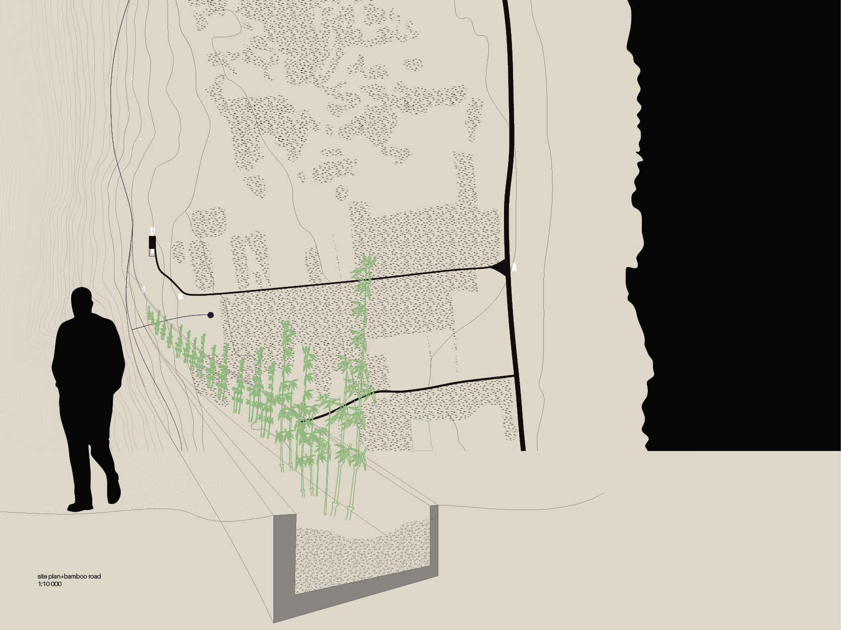 The structure is intended to connect two buildings with eachother, which currently have a concrete grounding inbetween, having one building lowered in relation to it, so the roof area can become the ground. Currently the concrete square is used by men to get some shade and clean their crops, eat betel nut etc, and it also has a sea view because of the slope. I decided to make the usage of the space more comfortable and more friendly towards the other contignent as women and teenagers. To improve the place, I thought they could have a temporary shelter constucted with using the bamboo from the road connecting to it, being able to reconstruct after a stronger taifuun or decaying with time. The shelter should provide protection from sunlight, water for cleaning the crops from the field and yourself+to drink, and an oppurtunity to cook what you got from the fields. The function of the space could change depending on the time of the day, being transformed into a meeting place for all during night, cooking and performing music or watch the local owl during midnight.