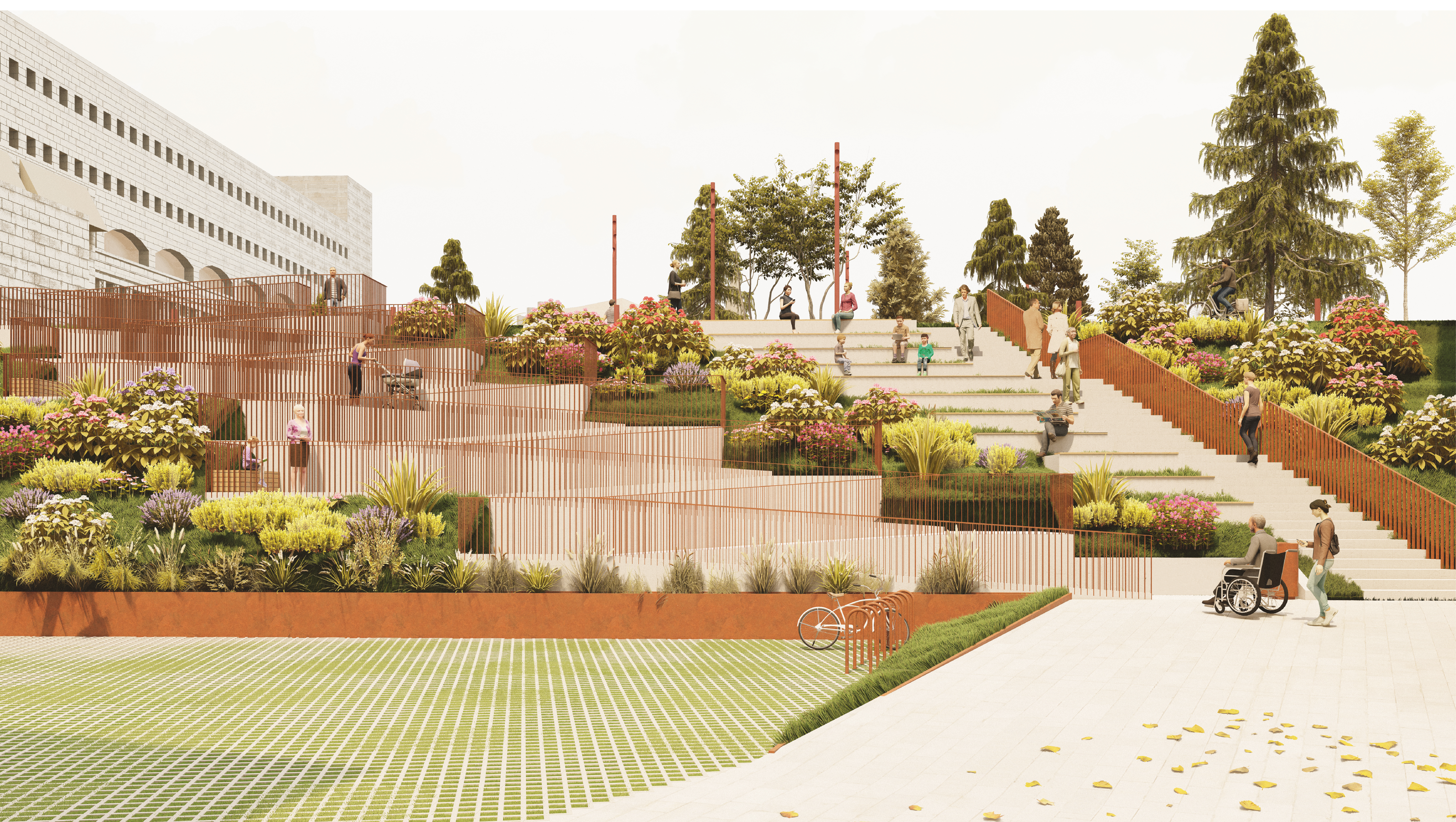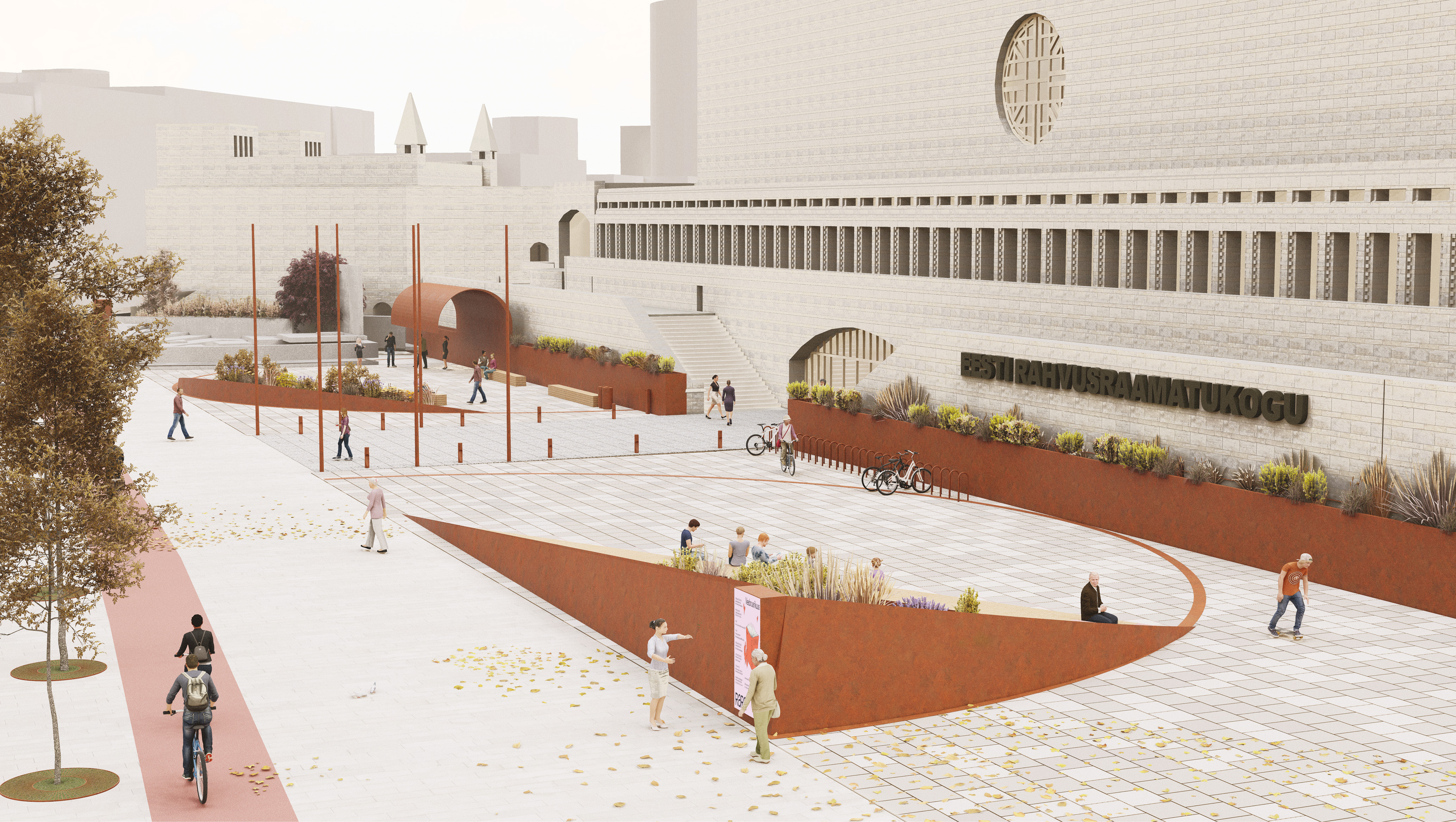 Rahvusraamatukogu väliruumi planeeritud elementide ühiseks jooneks on lisaks nende vormile ka materjal Corteni roostekarva teras. Materjali on kasutatud maastikuelementide äärtel, taimekastidel kui ka valitud inventari juures.