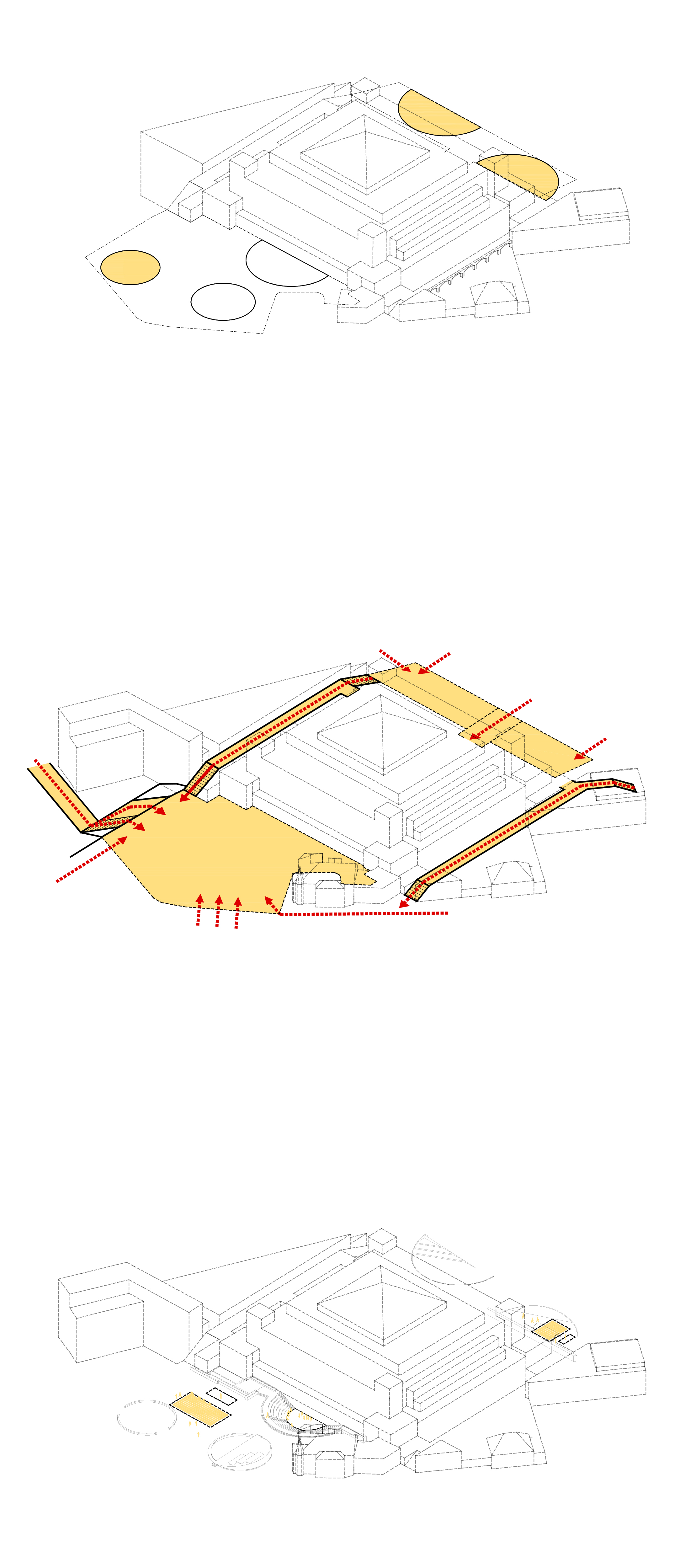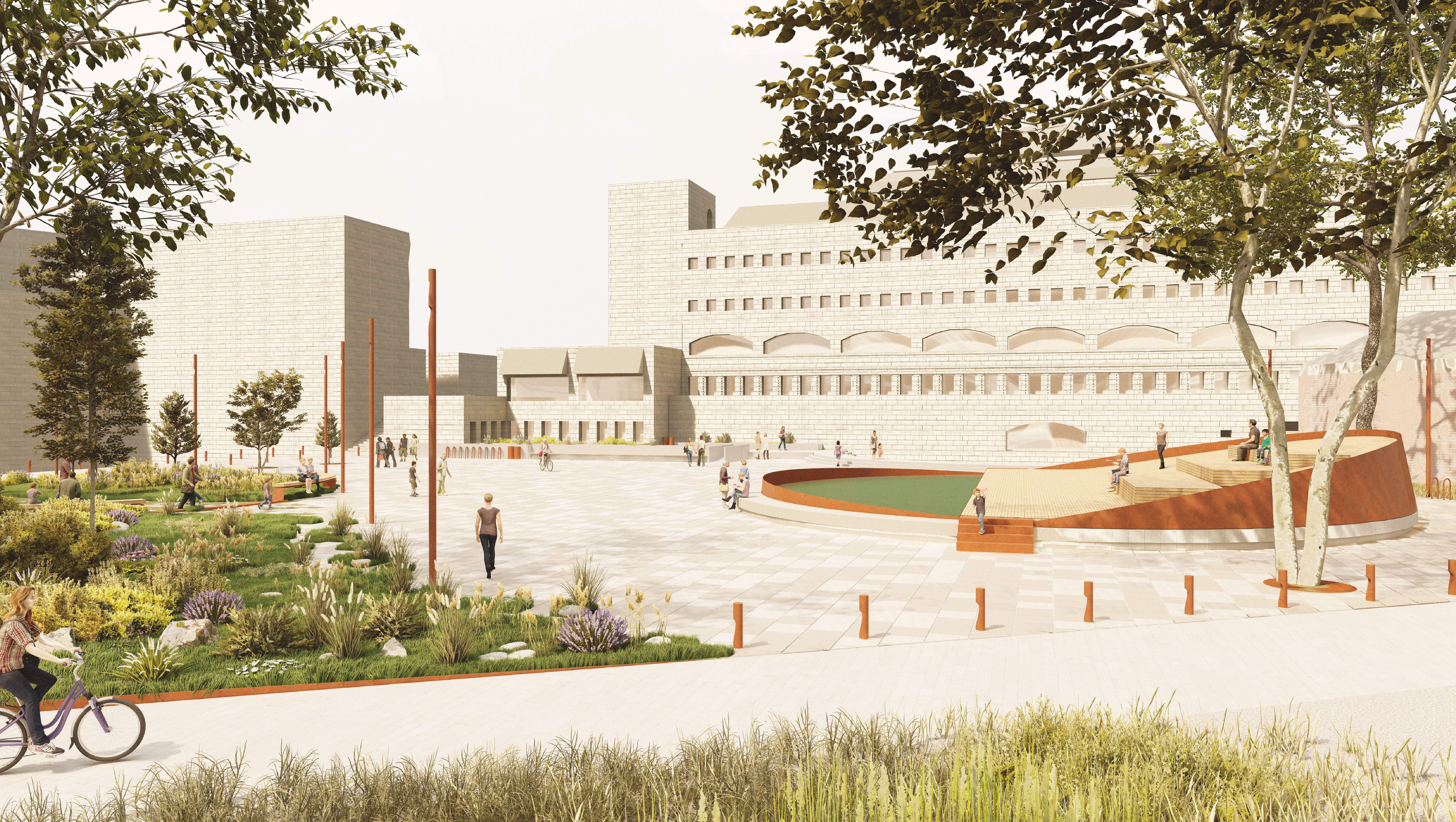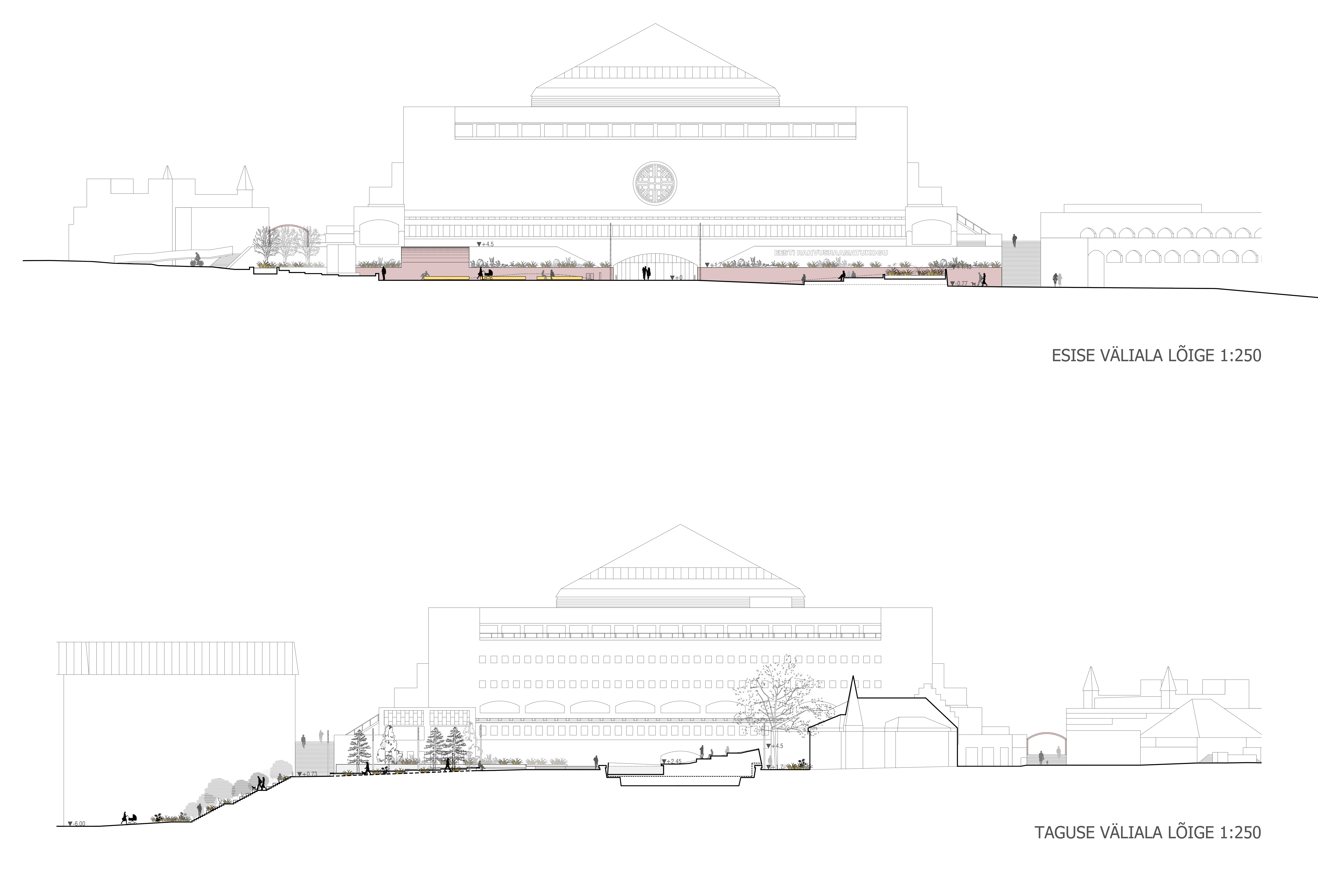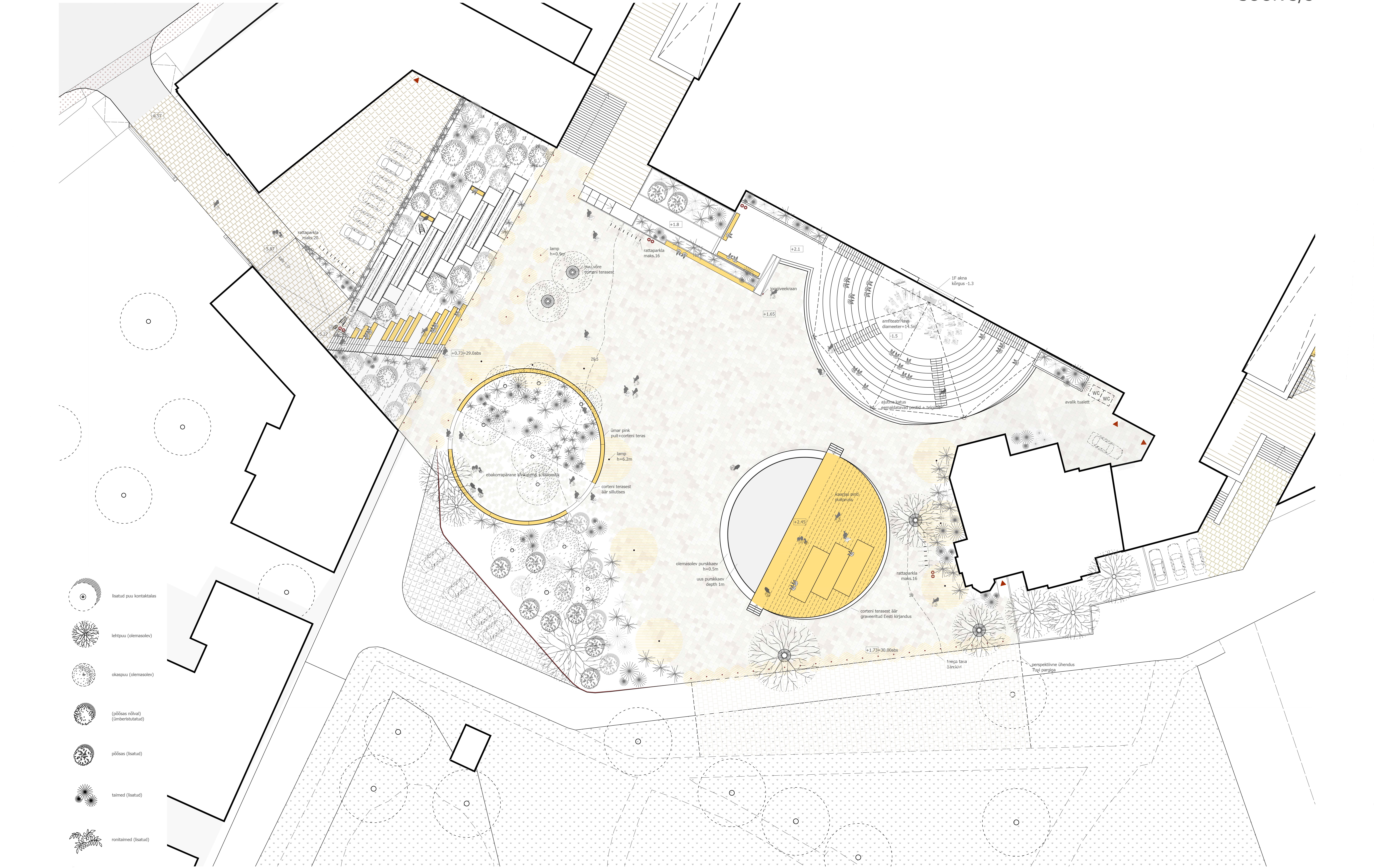 Rahvusraamatukogu taguses väliruumis on kaheks tugevaks ringjaks elemendiks olnud amfiteater ning purskkaev. Ideeprojektiga on amfiteatri lava on laiendatud ning tõstetud -1. korruseni, omab 4-ja kiiret treppi astmestiku vahel ja sujuvat ligipääsu välialalt lähenevale külastajale. Purskkaevu peale on loodud uus struktuur, mis koosneb kahest üles kaarduvast ringi poolest. Madalam pool on täidetud veega, kandes edasi purskkaevu mõtet. Teine ringi pool koosneb tõusvast pinnast ning sellel olevast kolmest astmest. See loob mitmekülgse ruumi, pakkudes kaarja pinna ning astmete näol istumis-ja olemiskohti. Projekt lisab ühe sõõri: rohealale ringpingi, et luua rahulik puhkepaik. See jaguneb kaheks osaks: lõunapoolne, mis on rohelusega põimunud kattekiviga kaetud ja põhjapoolne, mis on haljastatud olemasolevate puude ja taimestikuga.