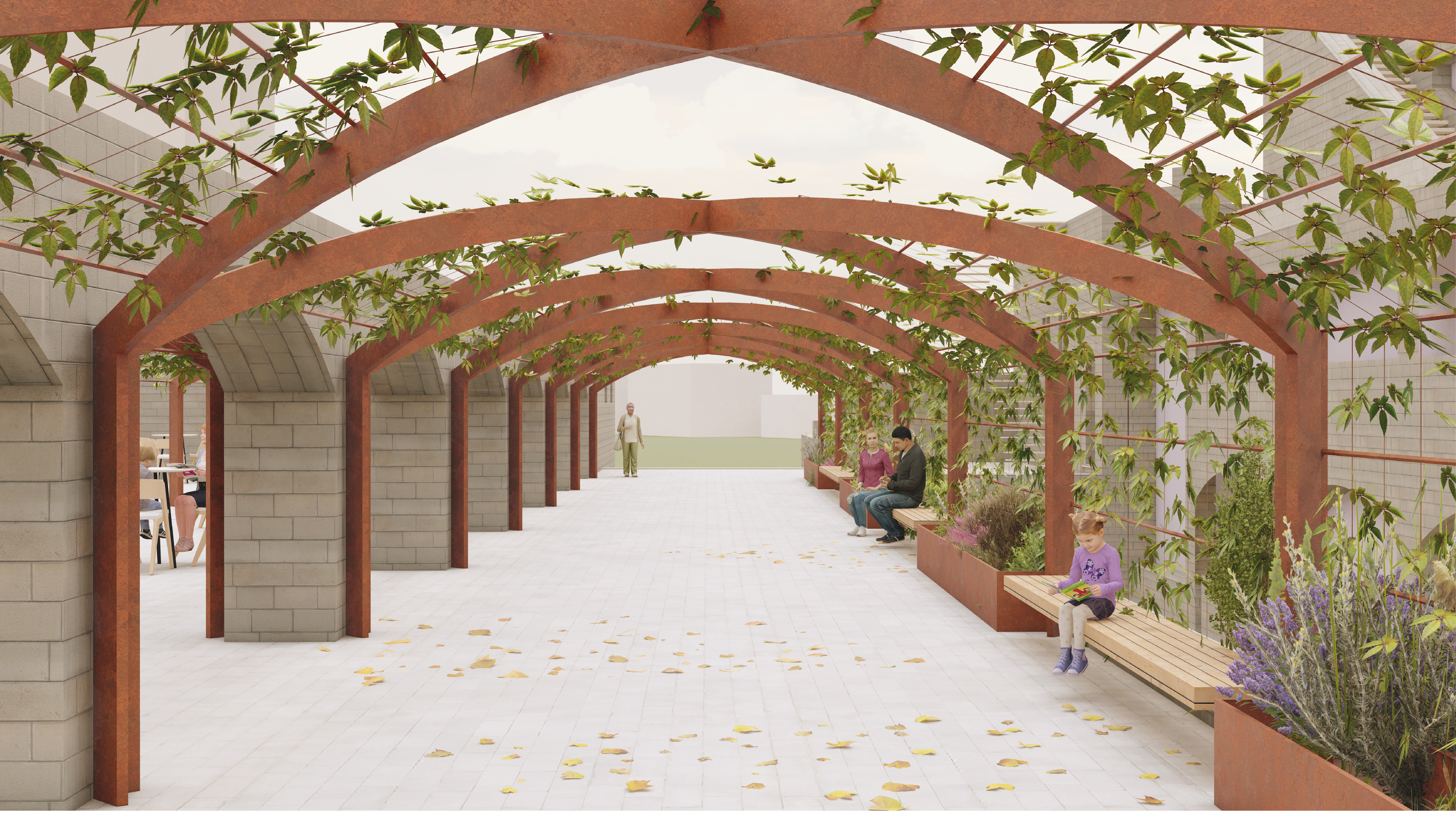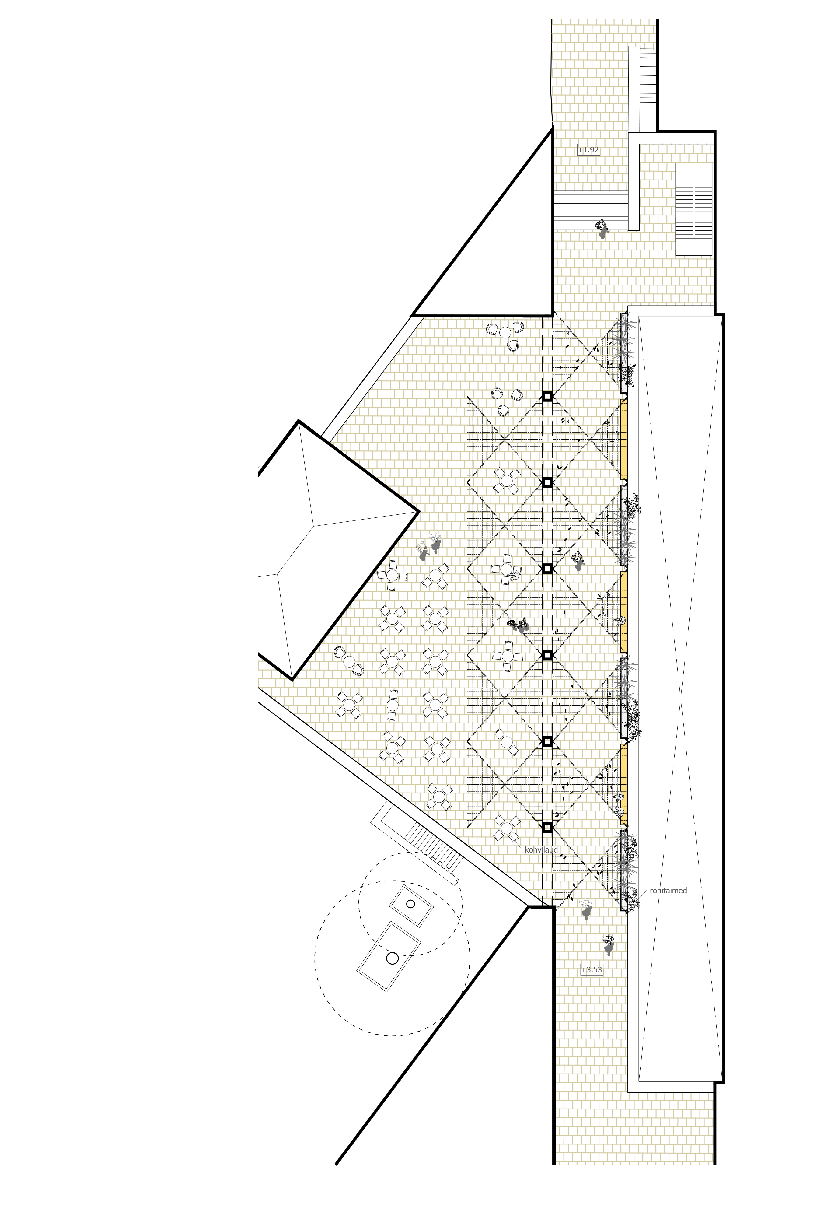 Rahvusraamatukogu kaguküljel asuv terrass ning läbikäik on toodud paremini nähtavaks kaarja pergolaga.