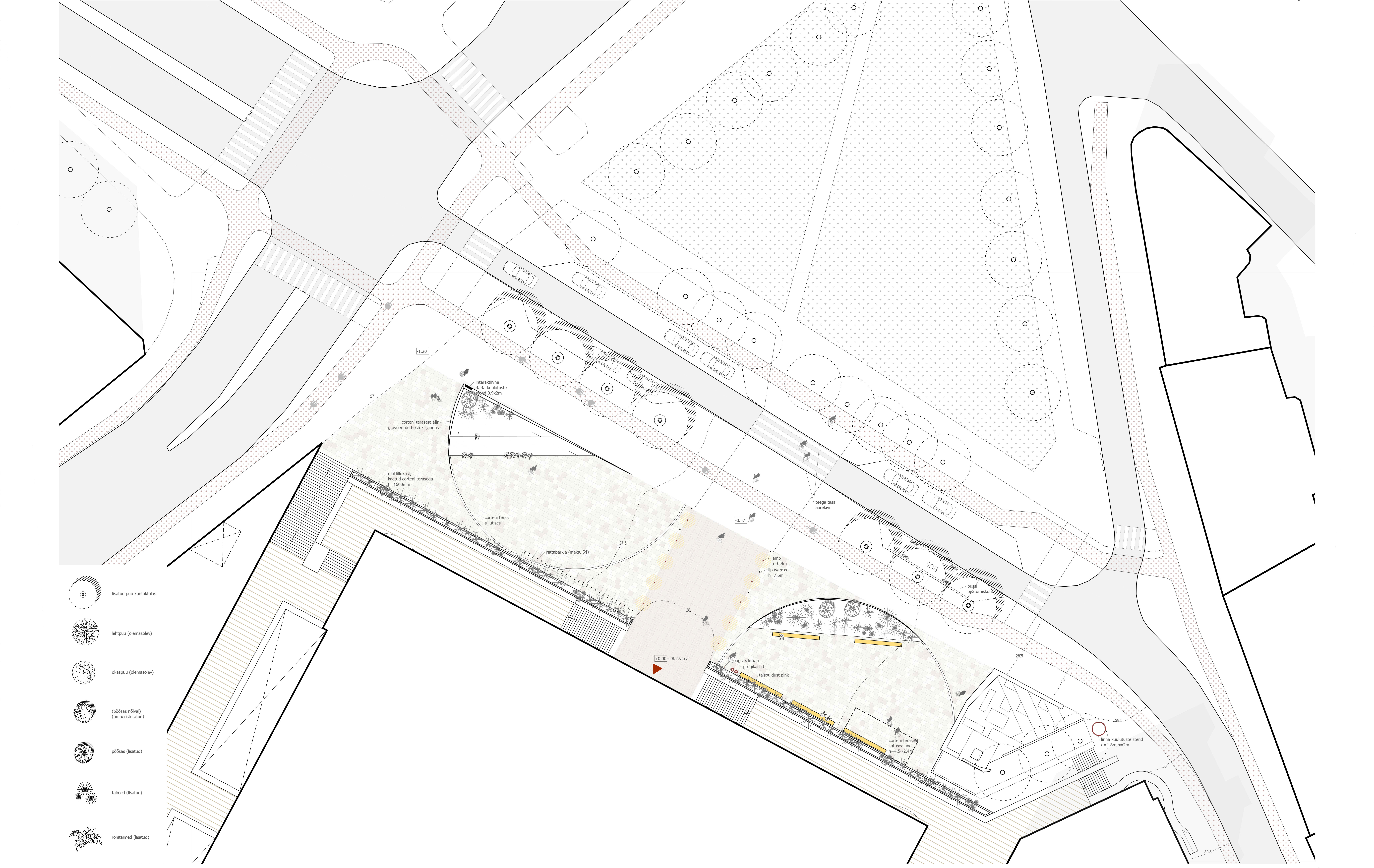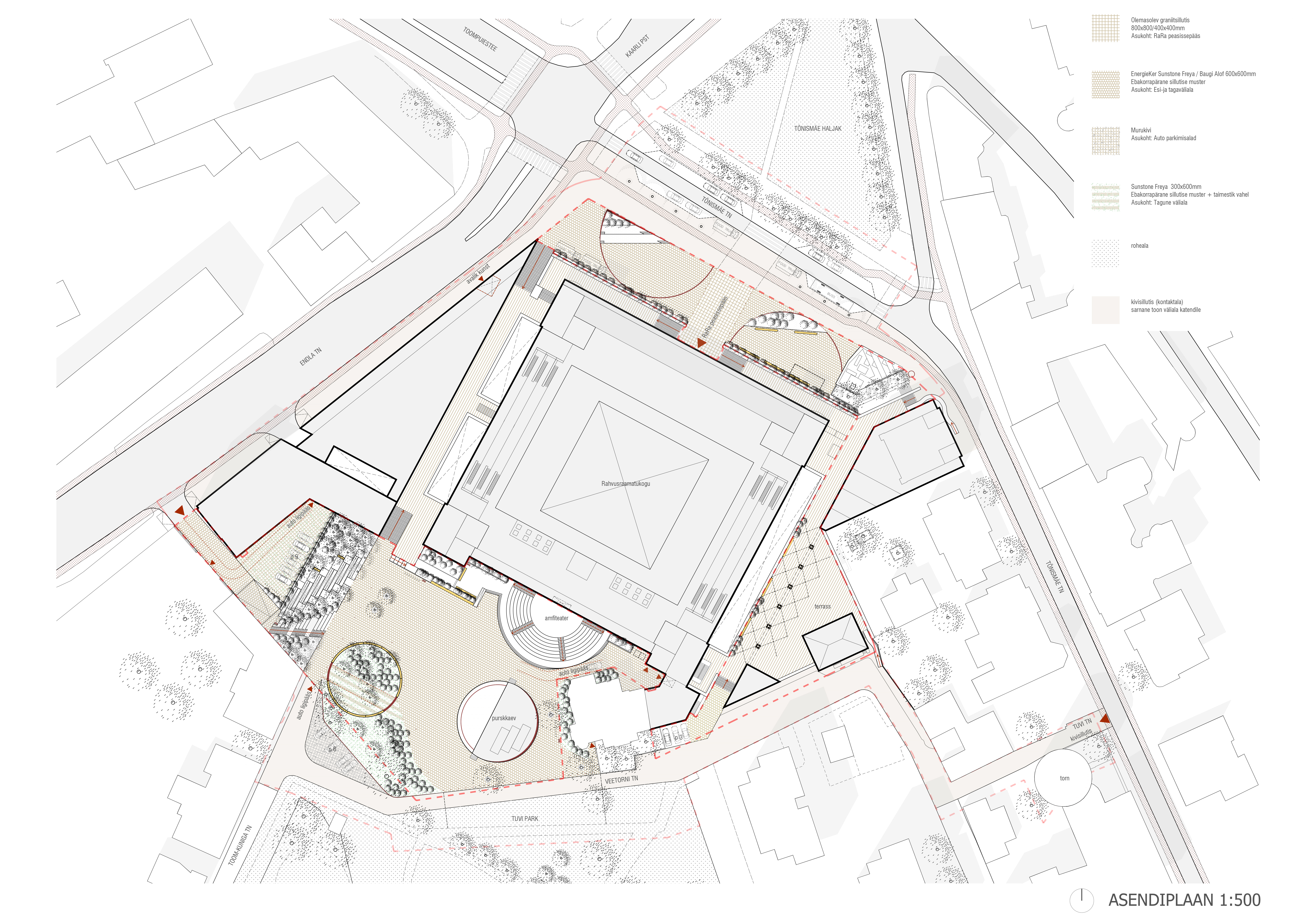 Rahvusraamatukogu esine säilitab rõhutatud peasissepääsu, kasutades olemasolevad graniitkatendeid ning piiritleb seda mõtteliselt lipuvarraste ning valgustitega. Väliala põhilised elemendid on kaks poolringi, mis on osaliselt tõstetud maastikuelemendid. Elemendid loovad sissepääsu rõhutava kui ka mängulise ja atraktiivse väliruumi. Lisaks aitavad need ala külastajat tänavast eraldada, pakkudes eri tüüpi puhke-ja istekohti. Elemendid jätkuvad sillutises ringjalt materjali näol. Endla tänava poolne astmeline maastikuelement on visuaalselt hästi nähtav, mistõttu on selle küljes ka interaktiivne RaRa ürituste tahvel. Teise poolringi tõstetud osa on haljastatud, luues eraldatuma ruumi viiele pikale pingile. Alal on kaarjas varjualune, mis kasvab välja Rahvusraamatukogu piiritlevatest taimekastidest.
