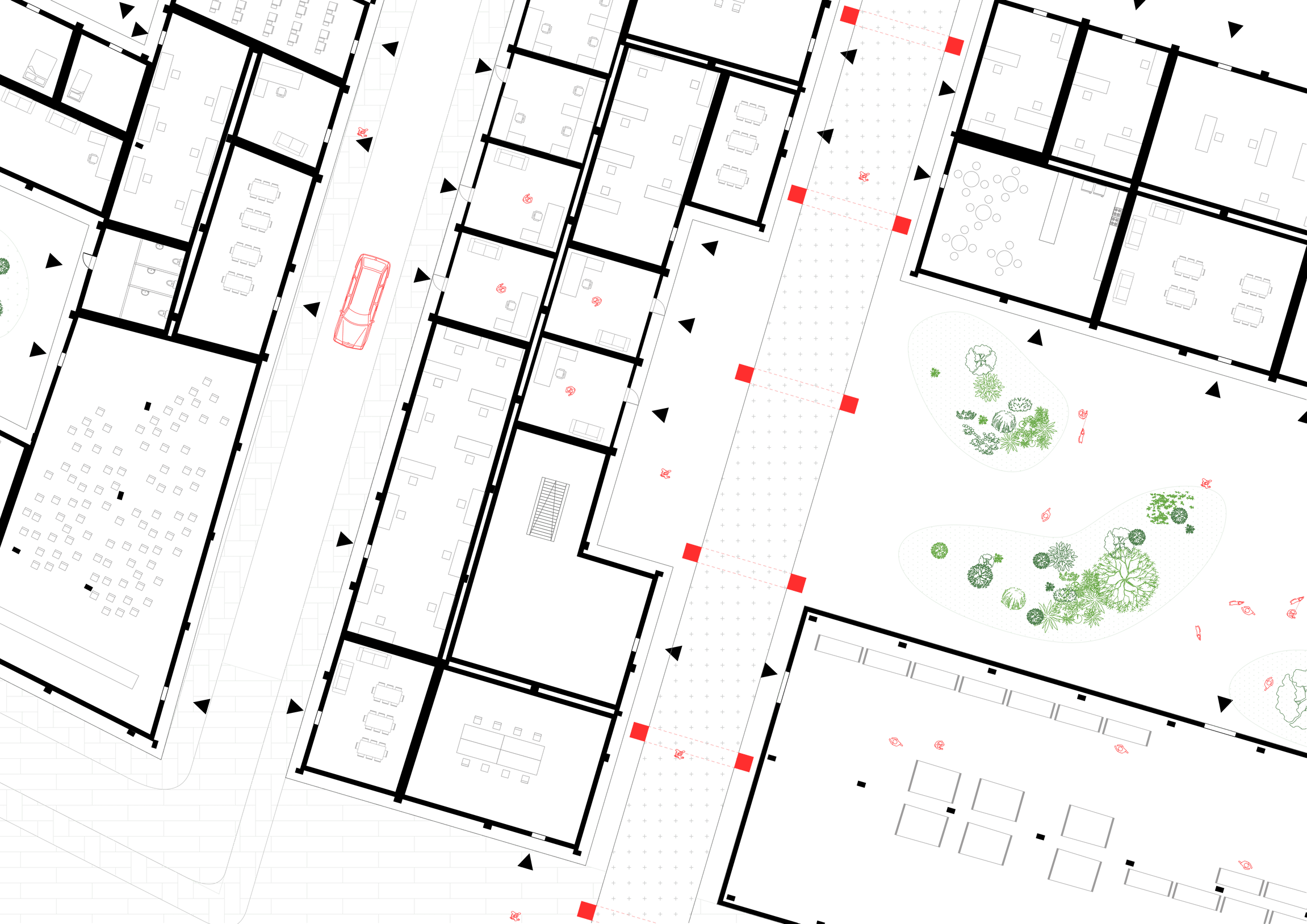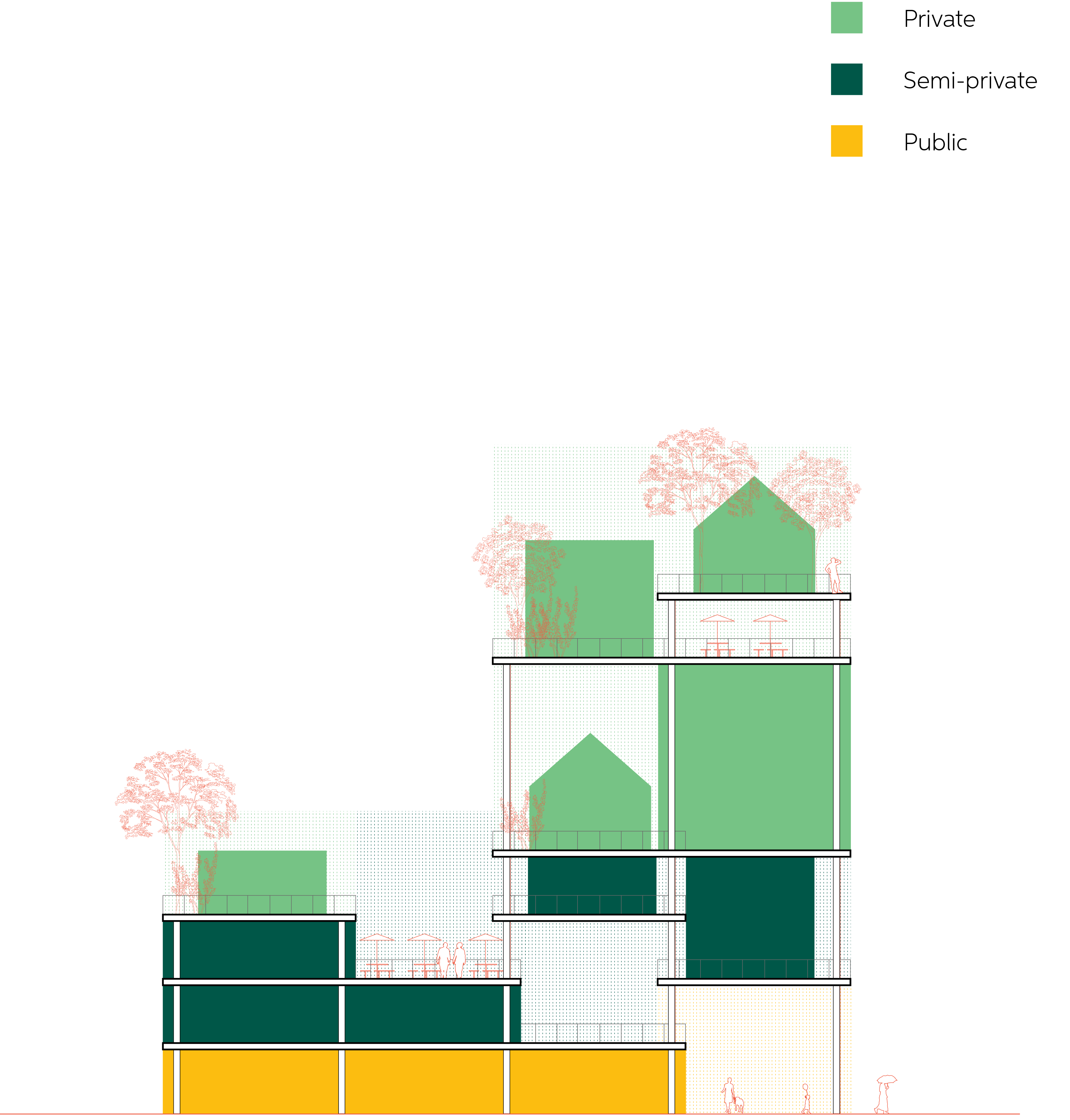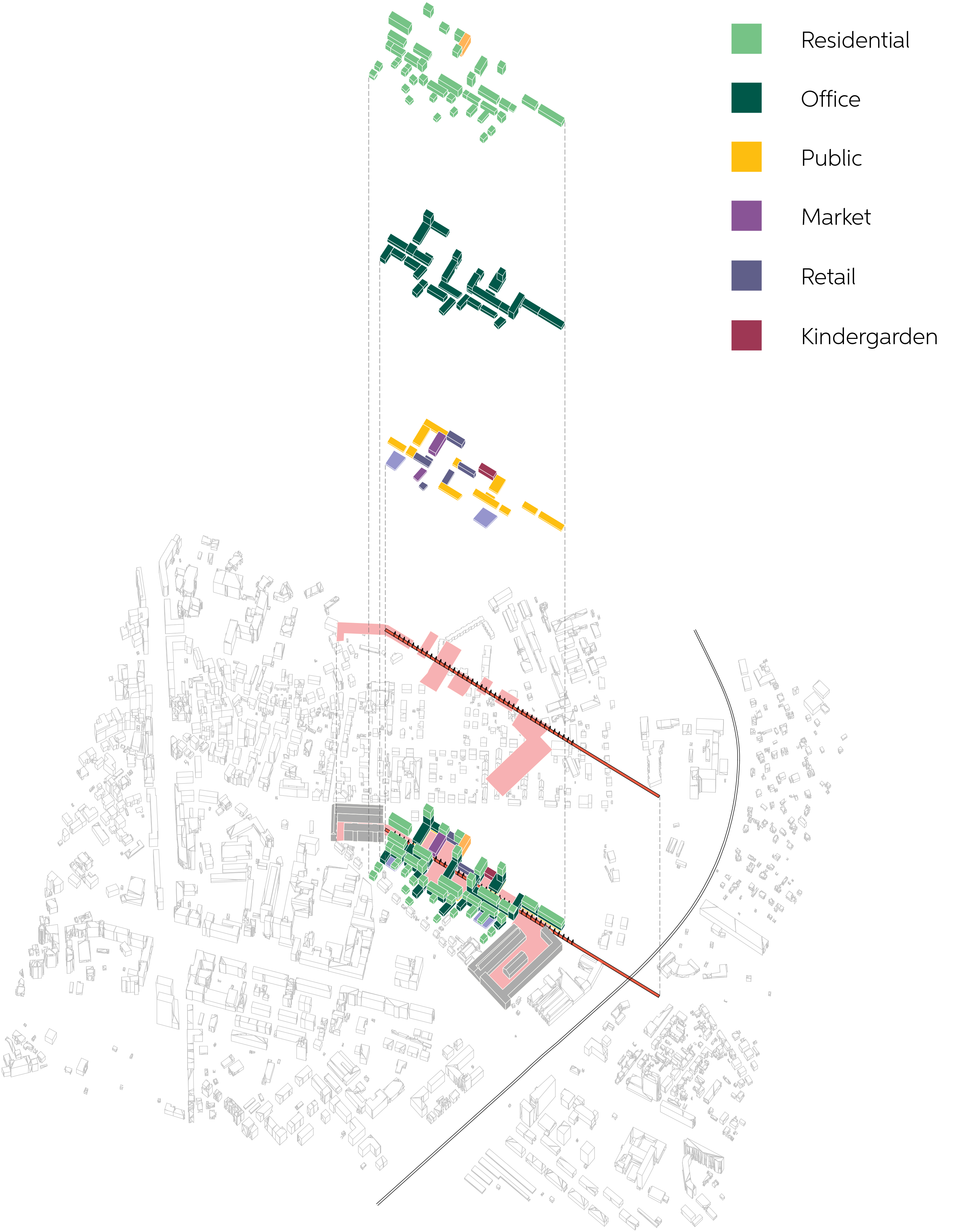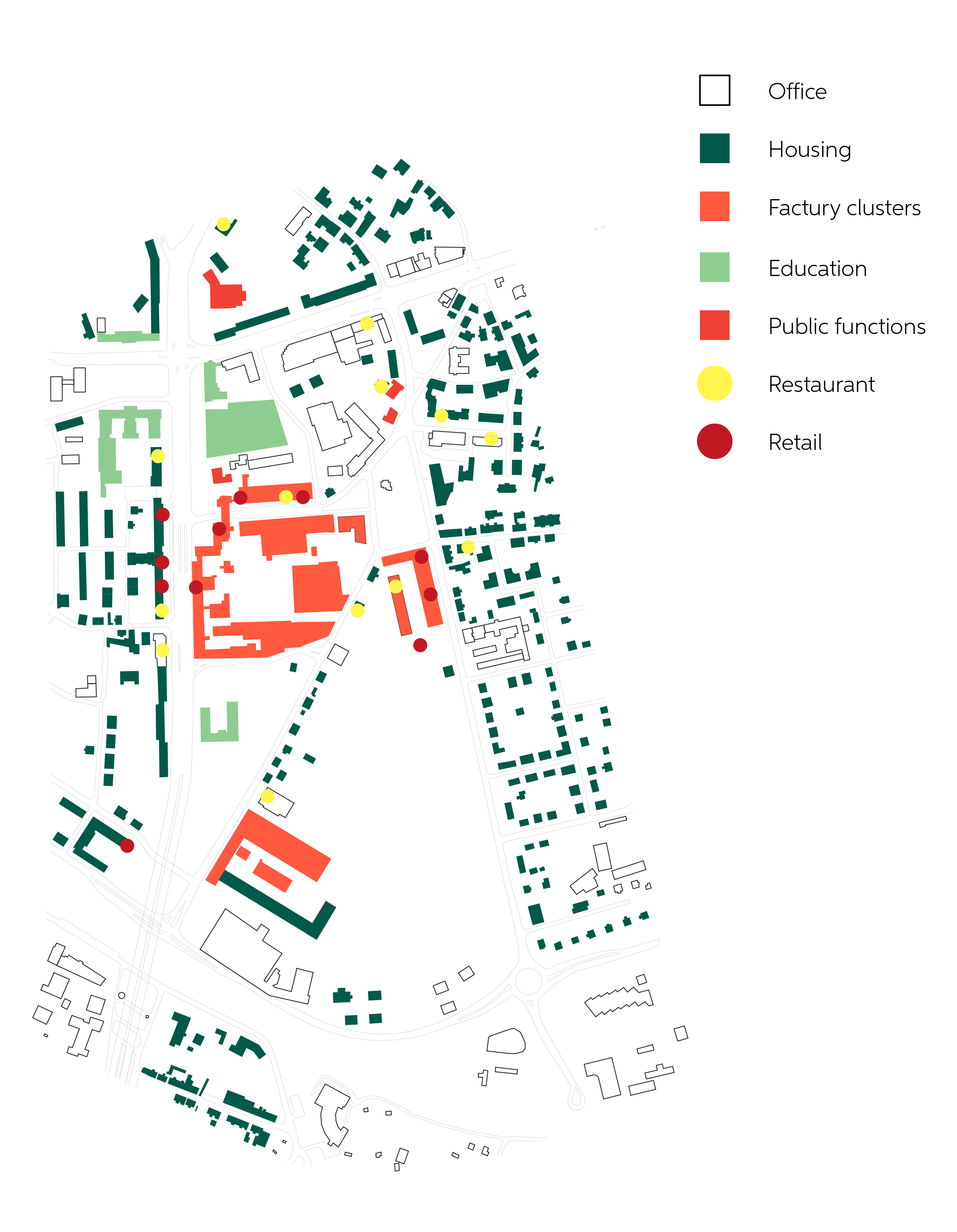 The transition of function is changing together with height and building types, having public functions on the first floors and more nearby the public squares. They blend with semi-public parts into private housing in the upper parts and in smaller buildings around inner courtyards.
